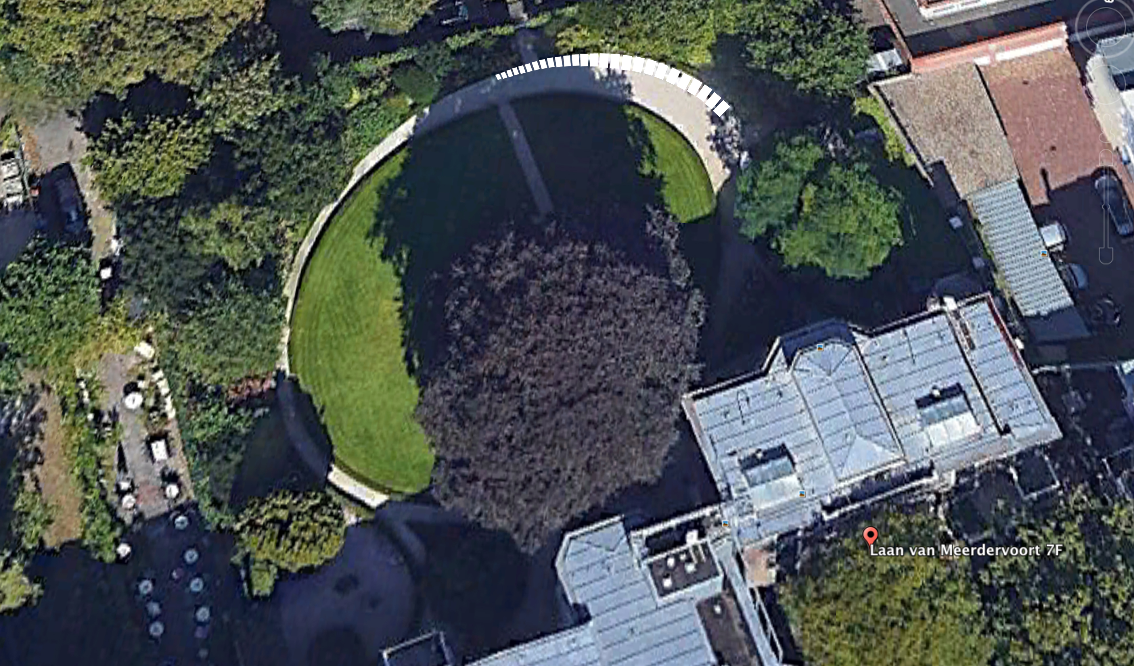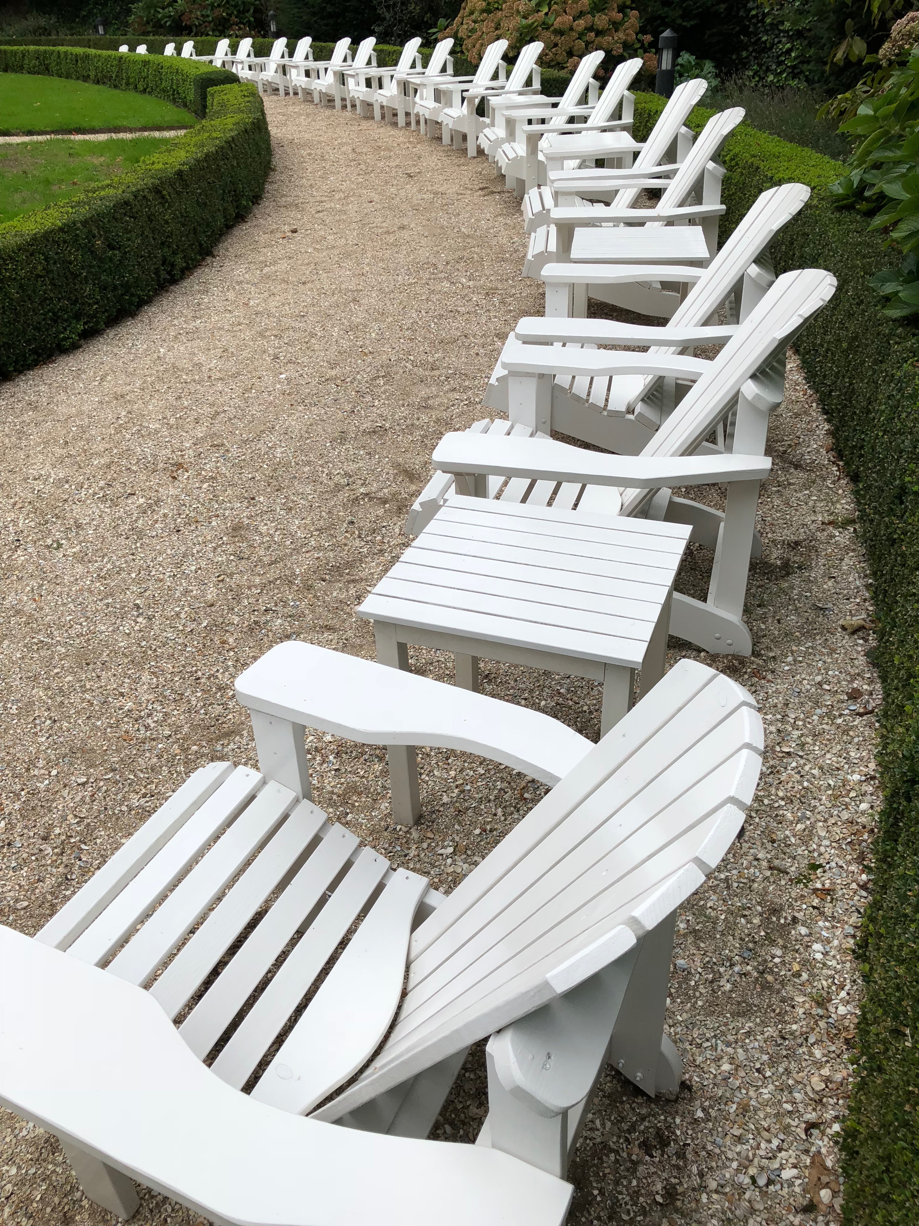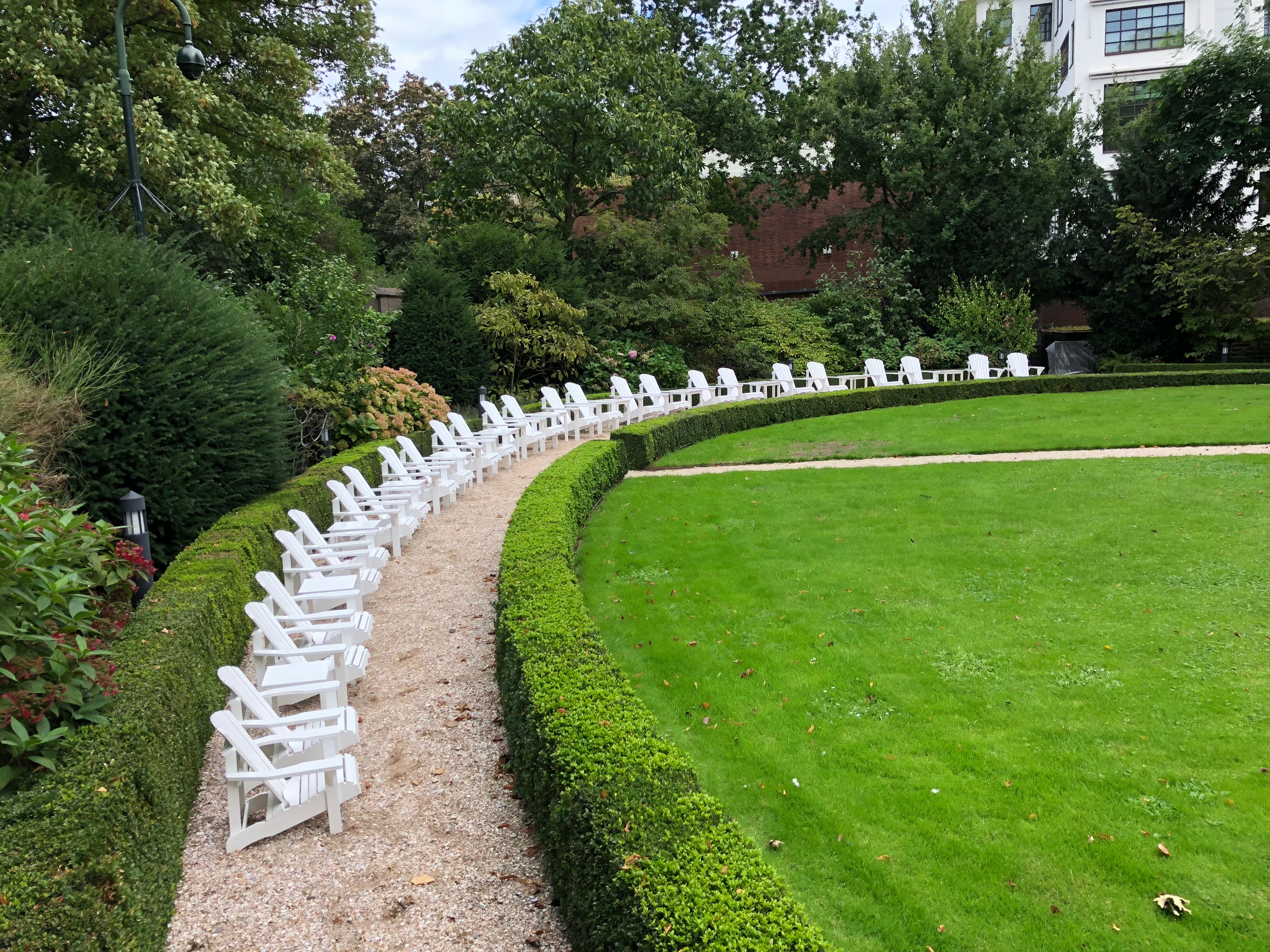The increasingly narrowing gravel path along the museum's oval backyard disappears in its own perspective. A row of bright white old-fashioned beach chairs, increasingly smaller in size, are lined up to disappear in the same perspective. The nineteenth century view of the sea has now disappeared, as Mesdag's view of the sea finally disappeared completely. White and light these beach chairs disappear into the horizon of the sea and in the perspective of time.