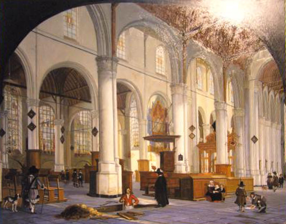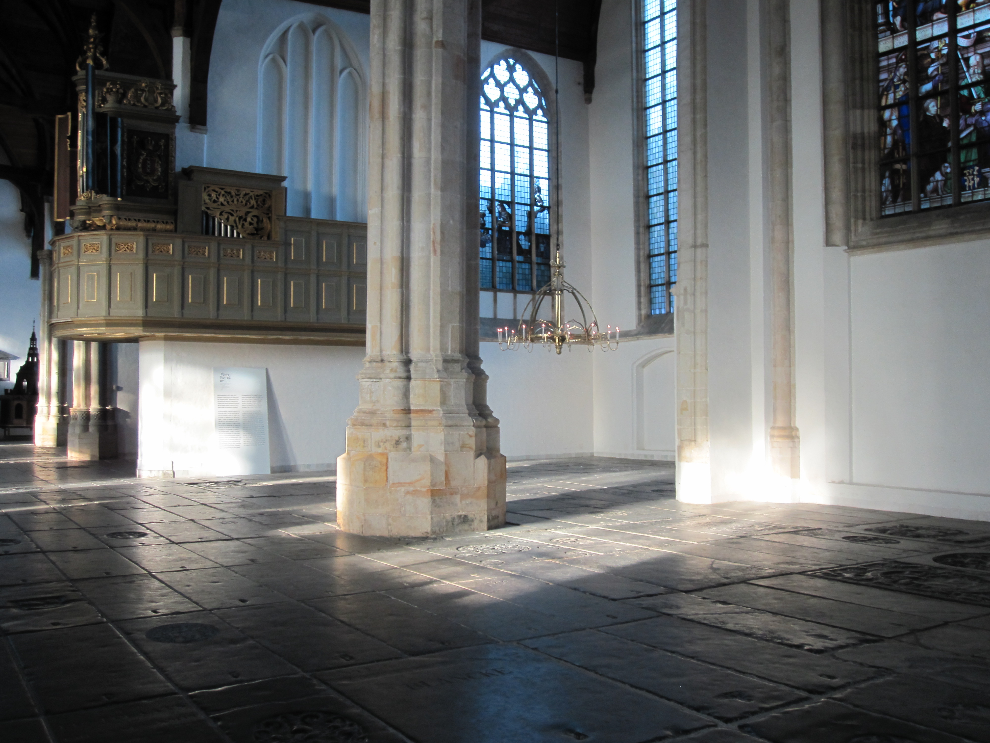 The floor of the Oude Kerk is a tightly arranged pavement of tombstones. Here we literally walk on the graves of the 'rijke stinkers', the honorary citizens of Amsterdam. Until the 19th century, well-to-do citizens had themselves buried in this most expensive burial chamber, securing their place in the immediate vicinity of the Holy Trinity. Their financial returns guarenteed a foundation that allowed the building to gradually develop into a cultural treasure. Thanks to the financial pragmatism of the church this all became possible: the church met the well-to-do citizen by exchanging a heavenly grave or grave monument for a generous donation.