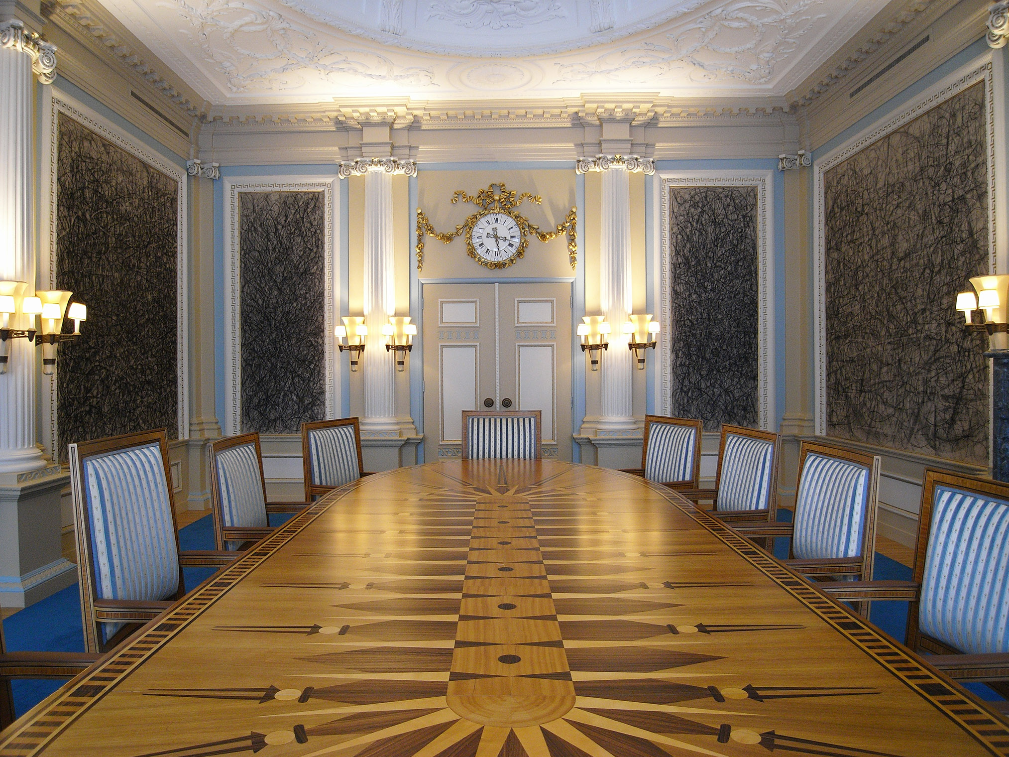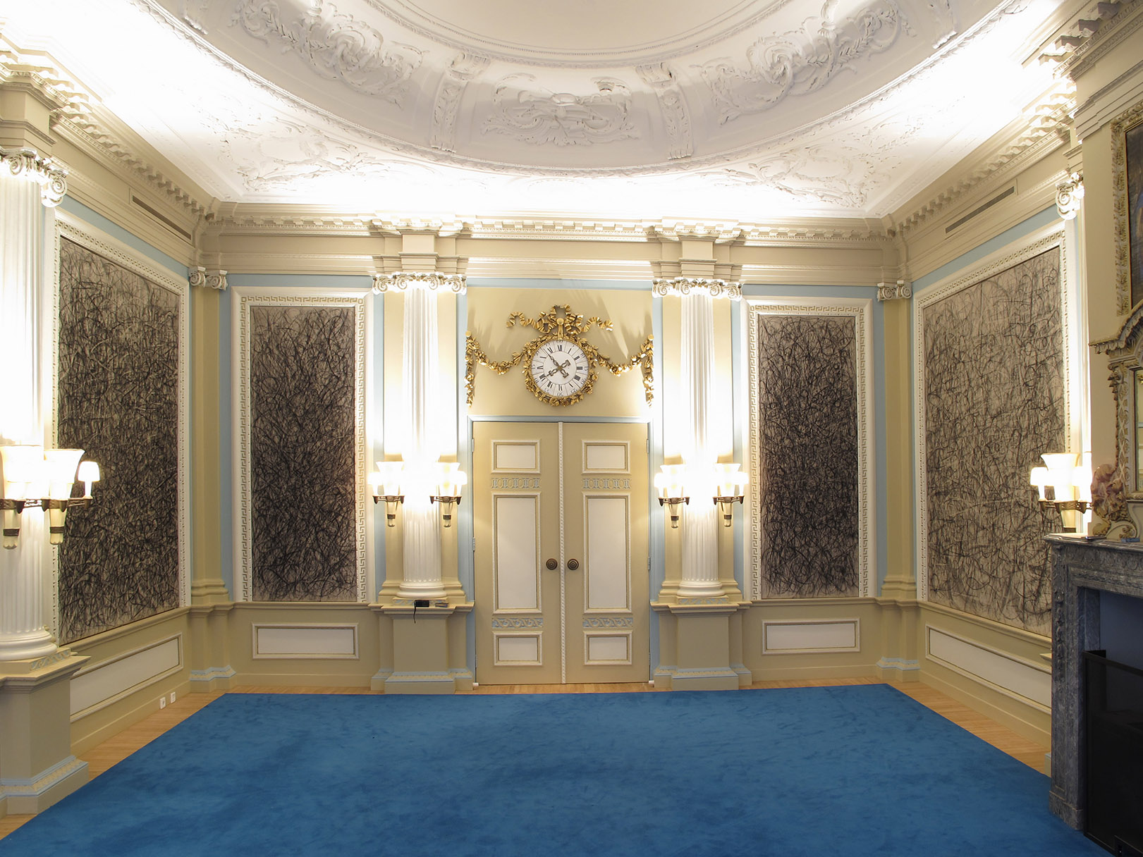 In the name of Thorbecke, the dogma of principled separation between art and politics was long held. Politics and art were long thought to be in a status quo of mutual respect, a contract of civilization. In recent years, the distance between the parties has become radicalized and each other's usefulness is contested in a rhetoric of contempt and cynicism. Between those who prescribe society and those who imagine it, however, there is a true bond. Parliamentary politics cannot exist without an extra-parliamentary counterpart. Where political space is bound, artists create all the space it needs. The government challenges the arts to develop new business models and revive old forms of patronage. They demand private parties to be challenged to invest in art. In this political context we are forced to rediscover forgotten relationships and developing new ones. How can politics and art reinforce each other? This design is a visual, but above all, a conceptual art application in the new provincial government building in Leeuwarden. It emphasizes the relation between art and politics, attempts to revitalize tradition and create future fruitful collaborations. The design is a triptych, titled Mecenaat Provinsje Fryslãn, intended in the most literal sense: the promotion and support of art and culture for reasons other than economic ones. Between them, the components of this triptych play on tradition and future, preservation and renewal. It reflects on the historic and the new building, from the perspective of patronage.