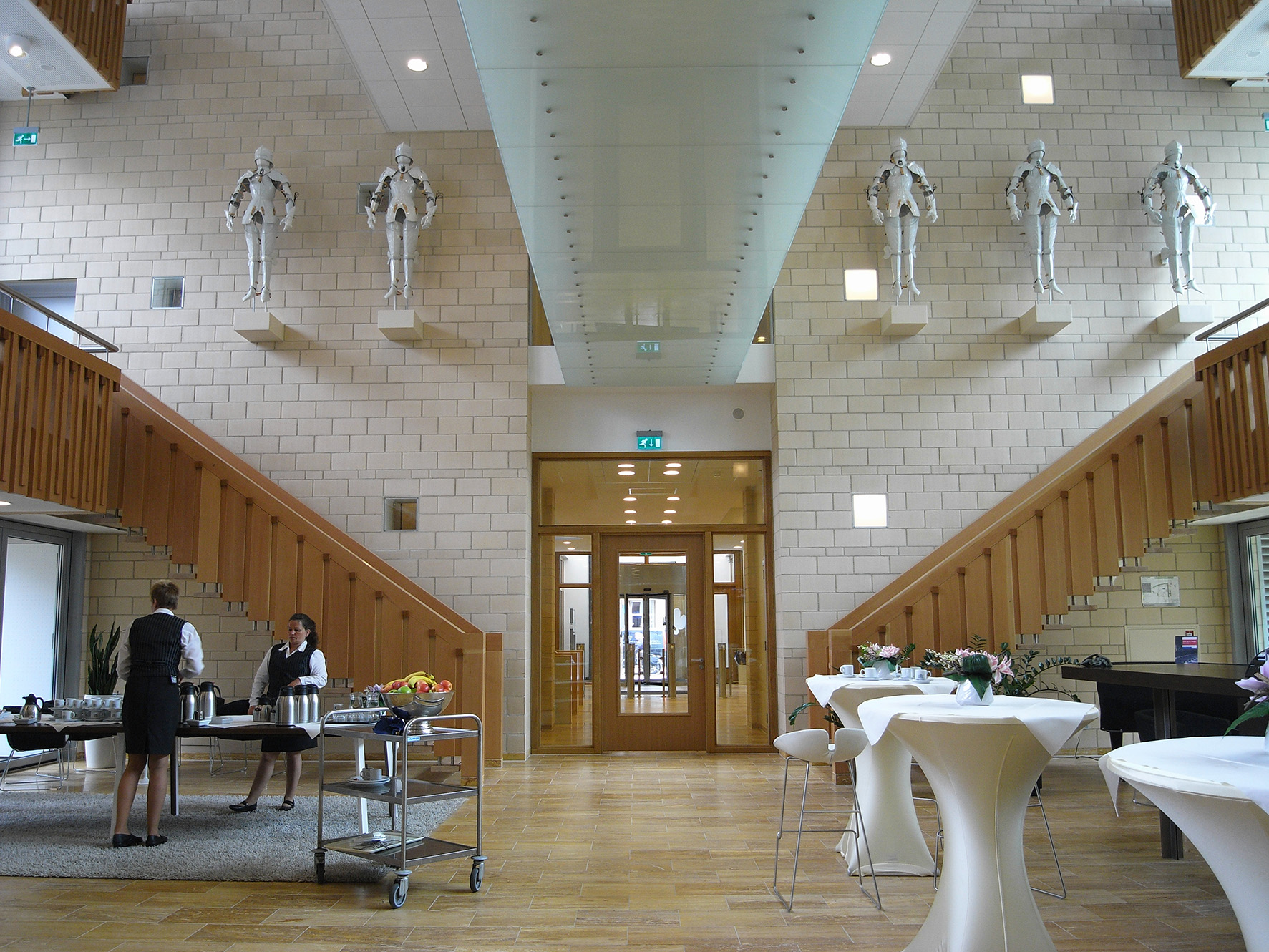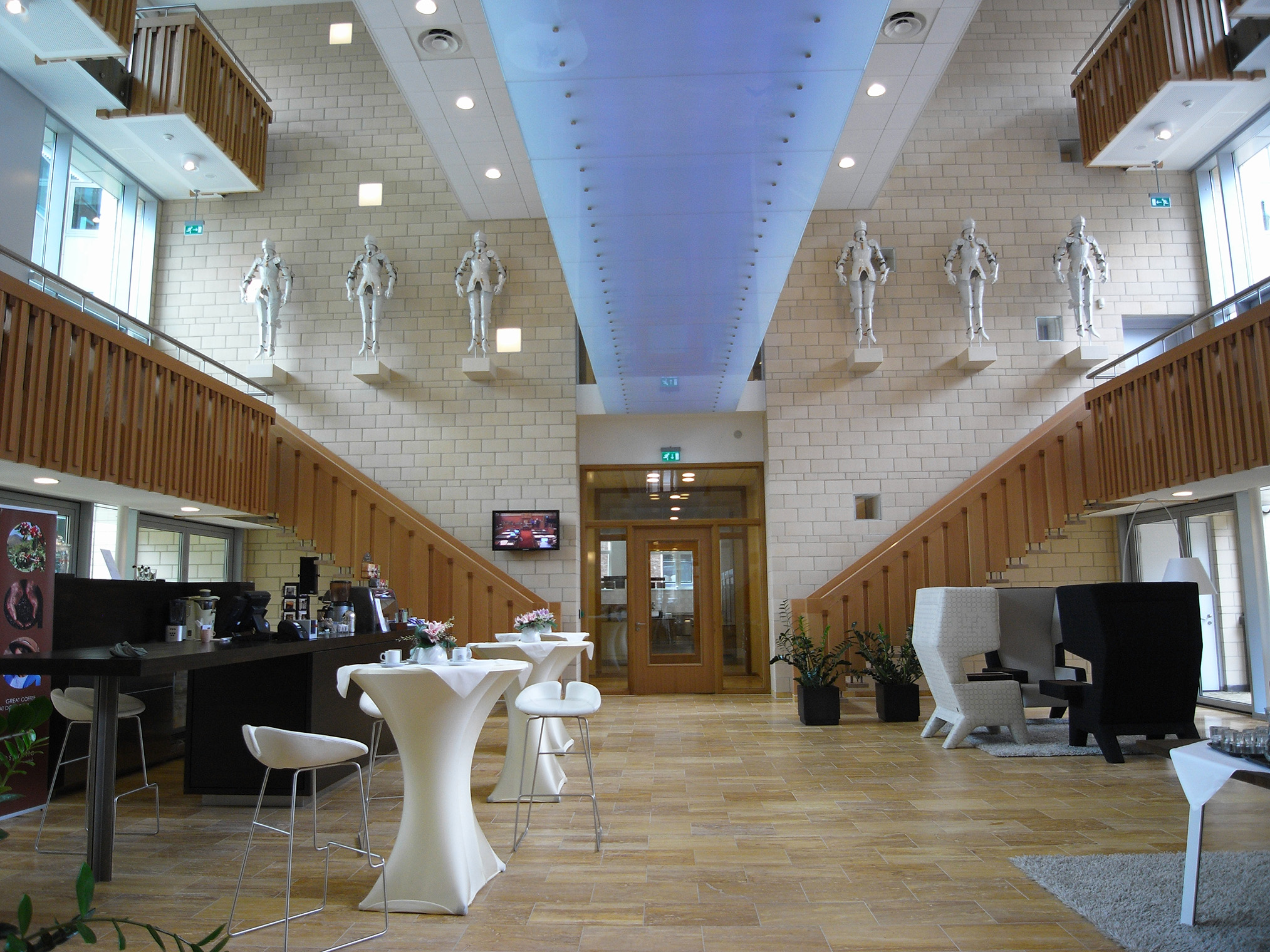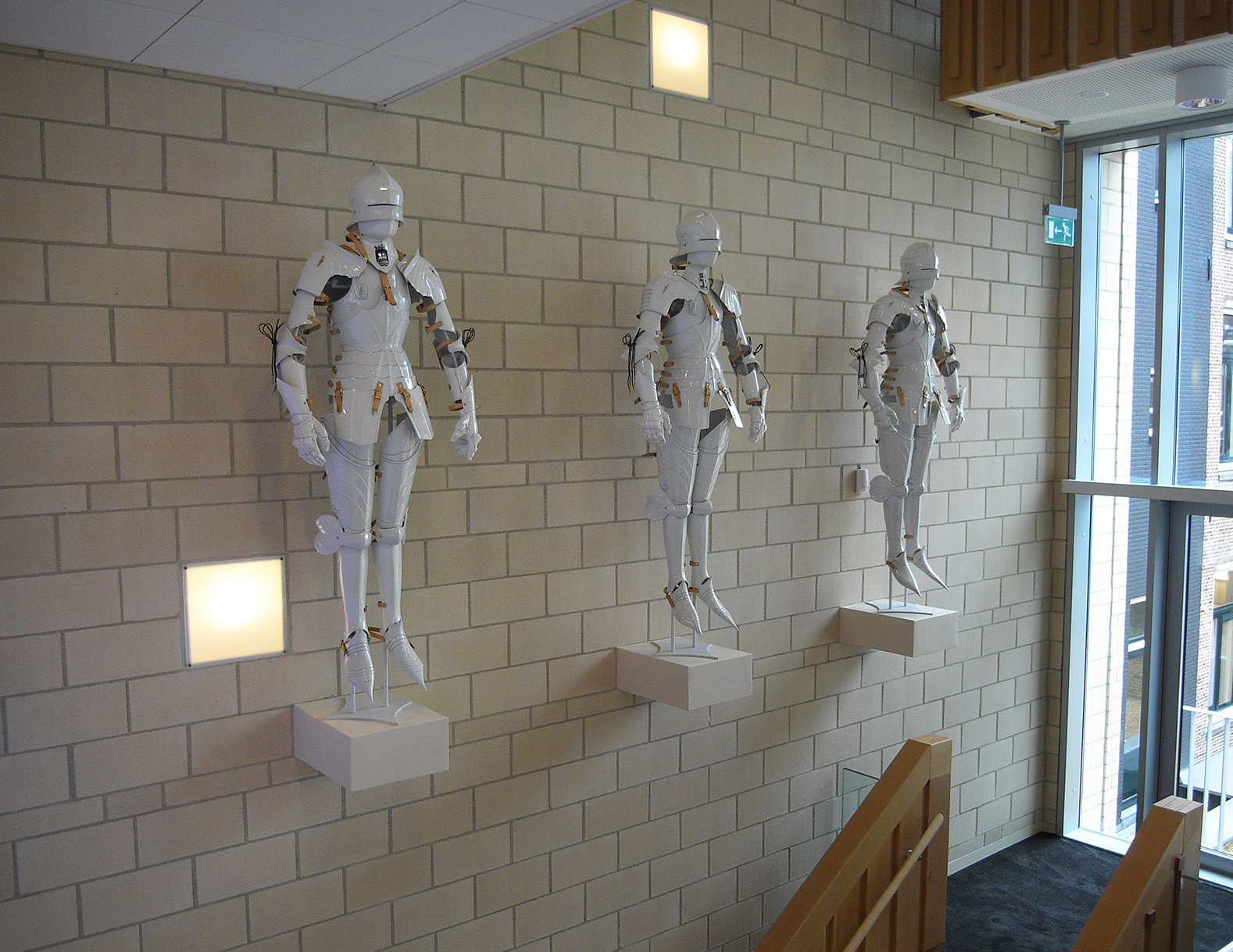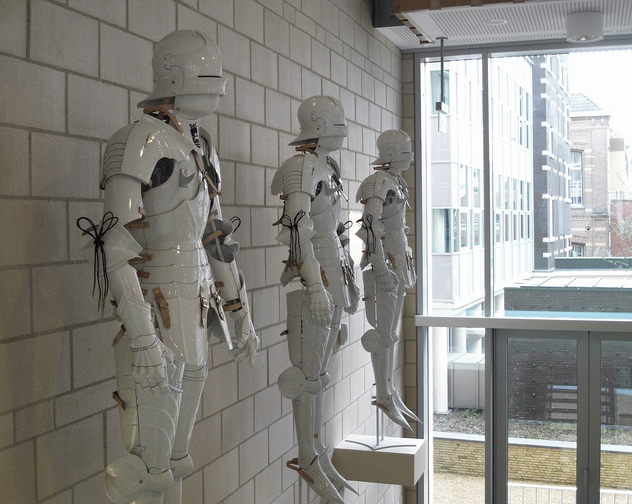 Âlvestêden is the second part of the triptych. In the marriage of the two buildings, the old and new County Hall, Frisian patronage is expressed. The new building embraces tradition and the old building shows generosity to the future. During the state meetings, I was struck by the sincere "gestalt" of Frisian tradition, which never seemed to have disappeared. Therefore, in the central space of the new Provincial House, there are eleven white porcelain armors, with closed visor, each with the emblem of one of the Frisian eleven cities on the cuirass. The strength of Frisian tradition is expressed in the armor, protecting it while showing its porcelain vulnerability. Porcelain lasts for centuries, but when it falls, it is broken.