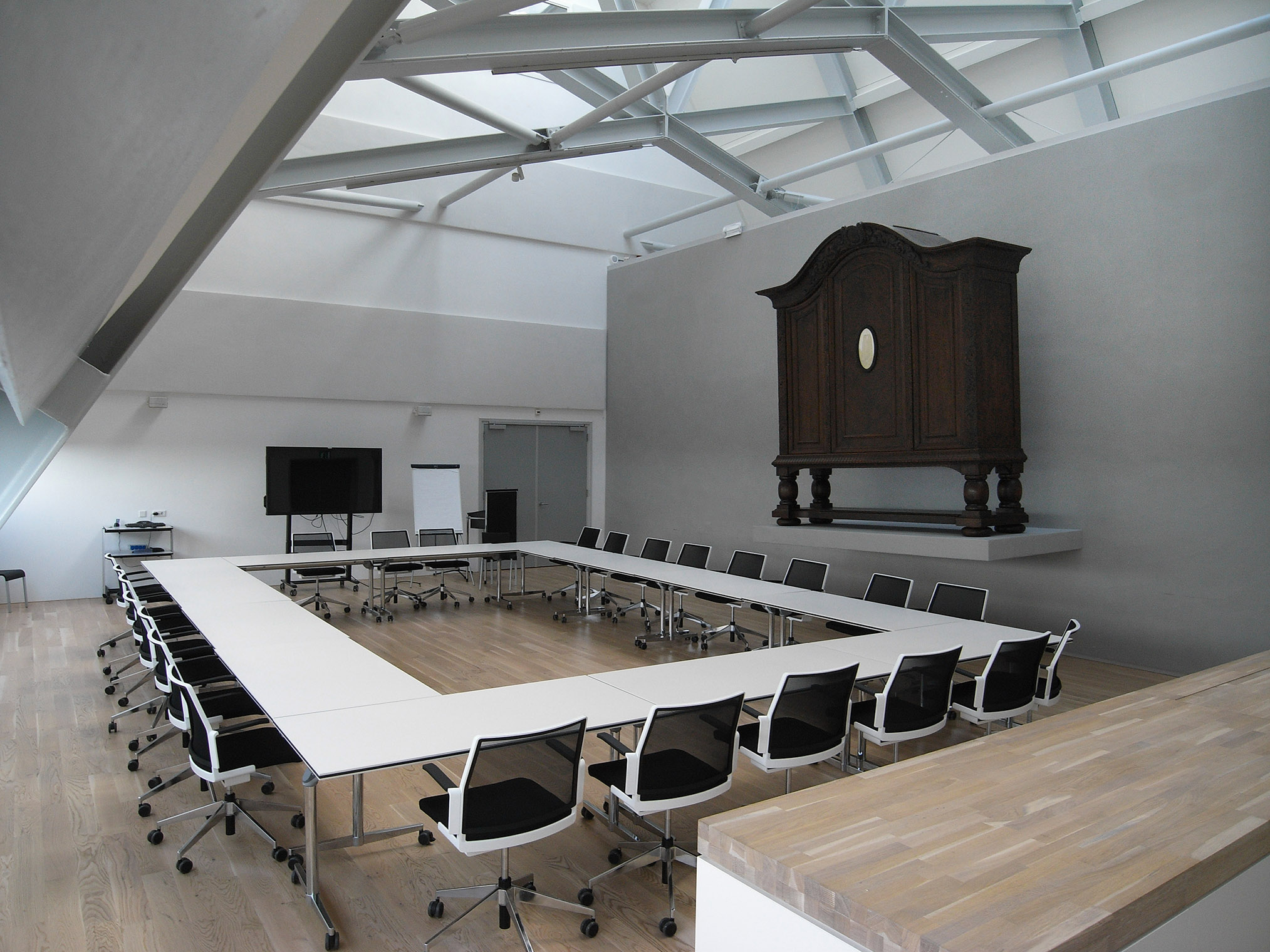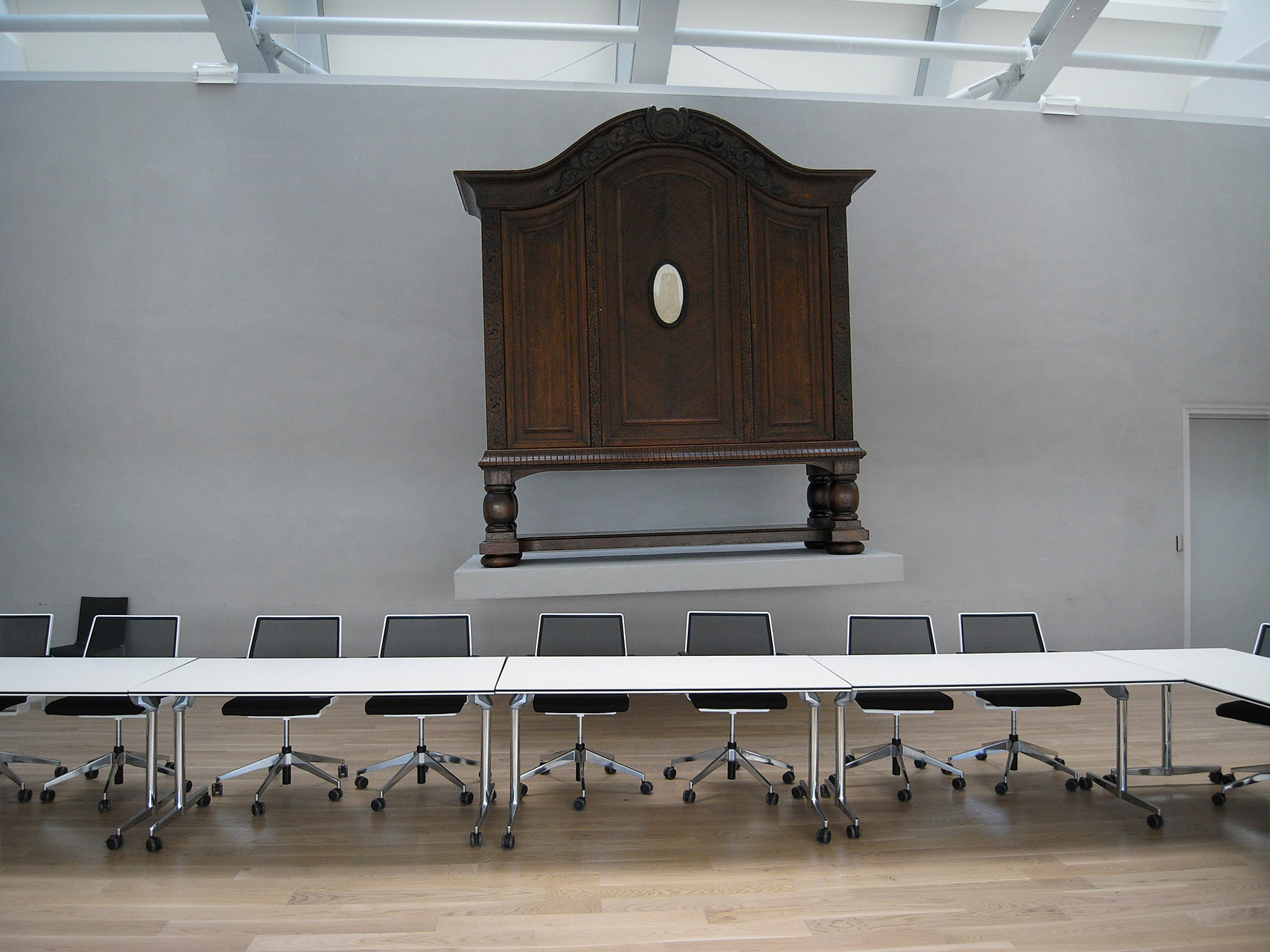 Patronage Provinsje Fryslãn is the central component of this artwork, which focuses on merit in the relationship between politics and art. The artwork will shape the meaning of political and private merit in the cultural field. A new regular agenda item is added to the provincial council meeting, in which periodically - for example, at the last council meeting of the year – an overview is given of initiatives and investments in culture and art. Important cultural investments - from governments, private parties or collaborations - are discussed and archived in a leaning large oak cabinet with an ivory image of the leaning Oldenhove in the center. The cabinet is skewed, straightening the Oldehove - the icon of Frisian patronage in the 16th century. Seen from the Oldehove, the world is askew. My intention is to use the character, courage, determination, stubbornness and beauty of Frisian culture, which also produced the Oldehove, to continue to set the world straight. In the old provincial house, this tradition is already underway: " Verritus and Malorix at Rome, Anno LIX. No mortal surpasses the Frisians in bravery and fidelity; Bishop Bonifacius preaches Christianity to the Frisians, Anno DCCXXXV; Eelko Liauckama and Feiko Botna beaten as knights after the conquest of Jerusalem, Anno MIC; Gemme of Burmania before Philip II, XXV October MDLV. We Frisians kneel only before God." The new County Hall will become infused with new history over time. In here a modern archive, recording the patronage of Frisian culture, will grow into a new historical tradition.