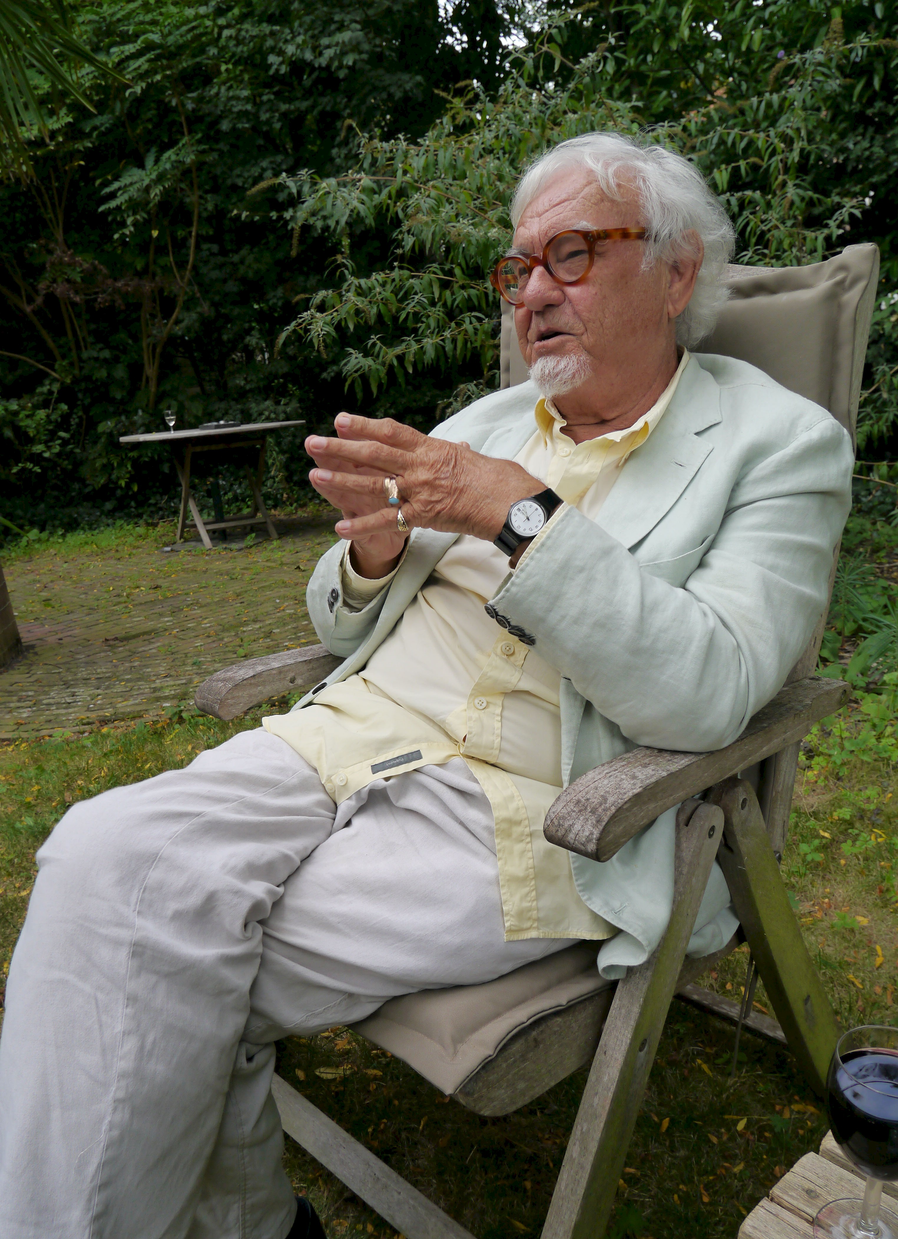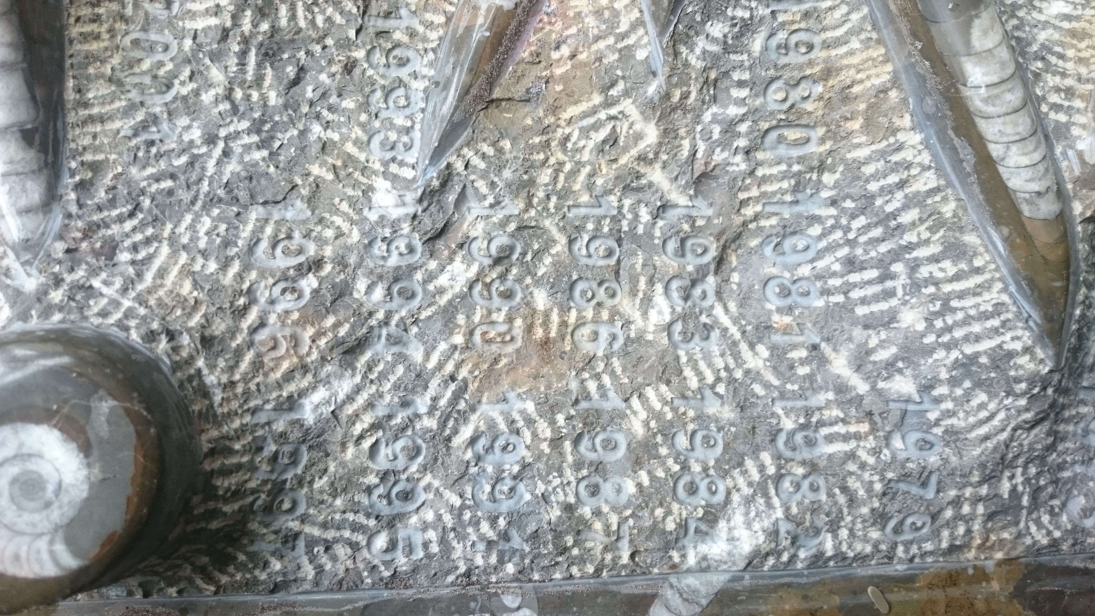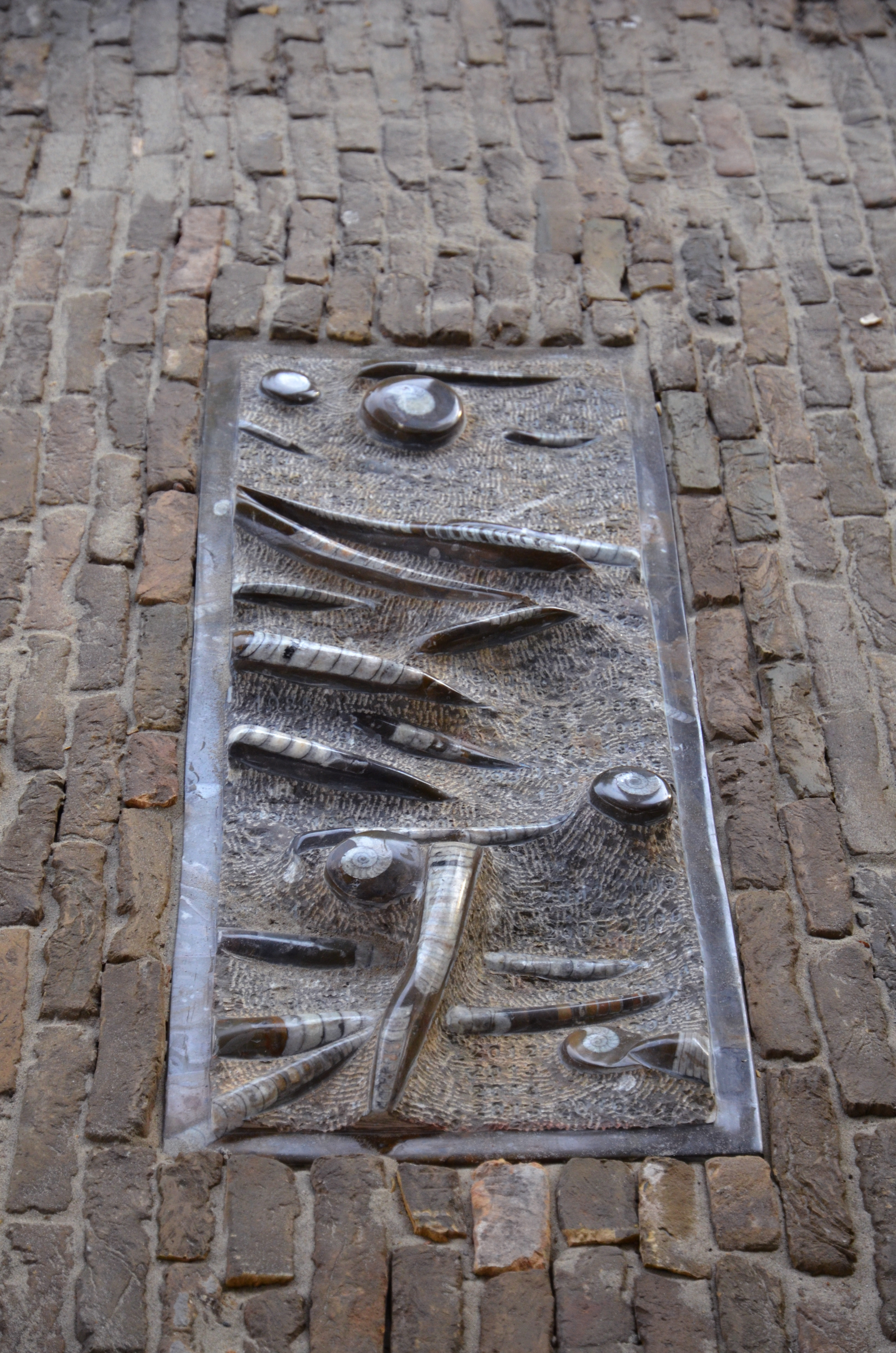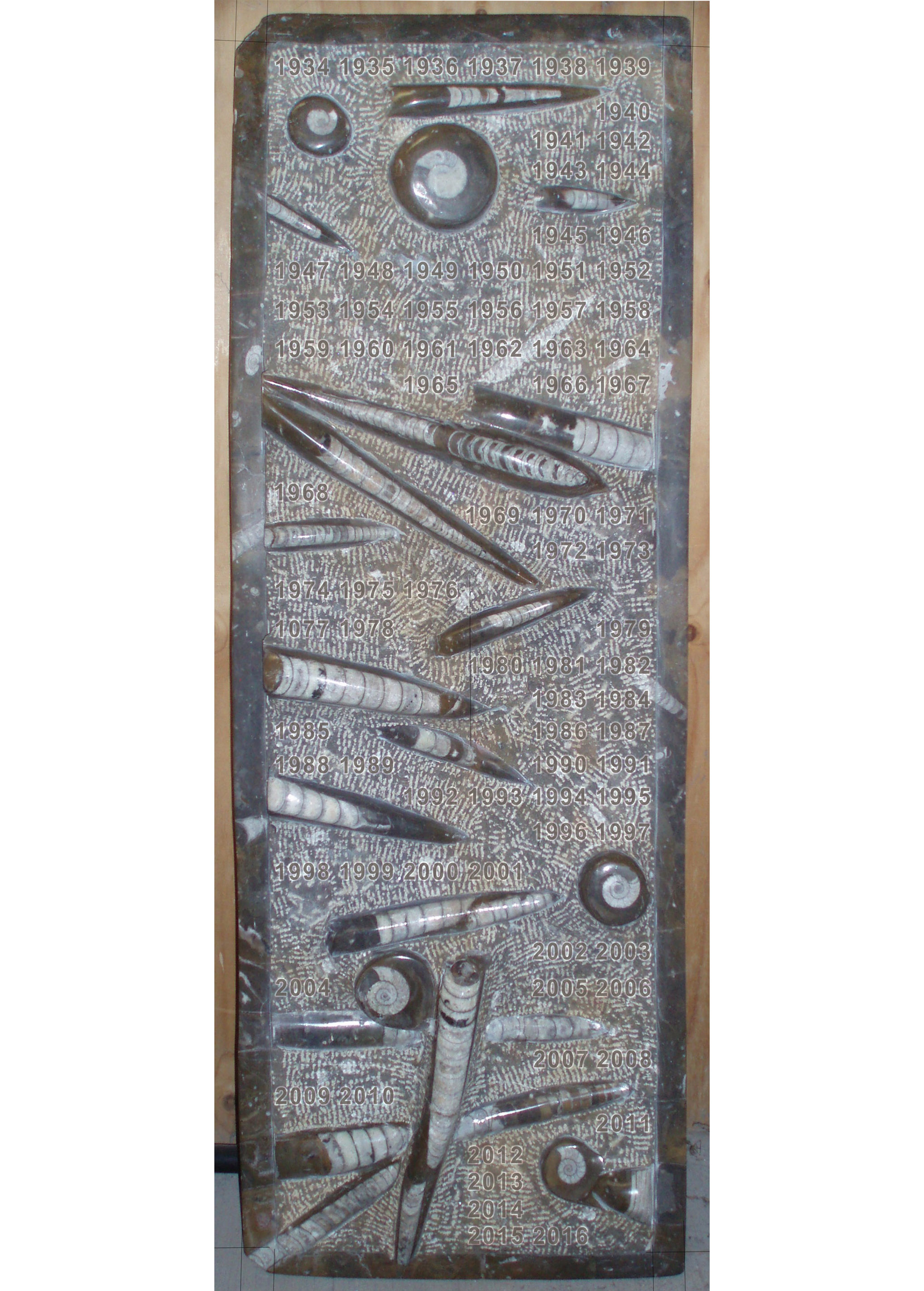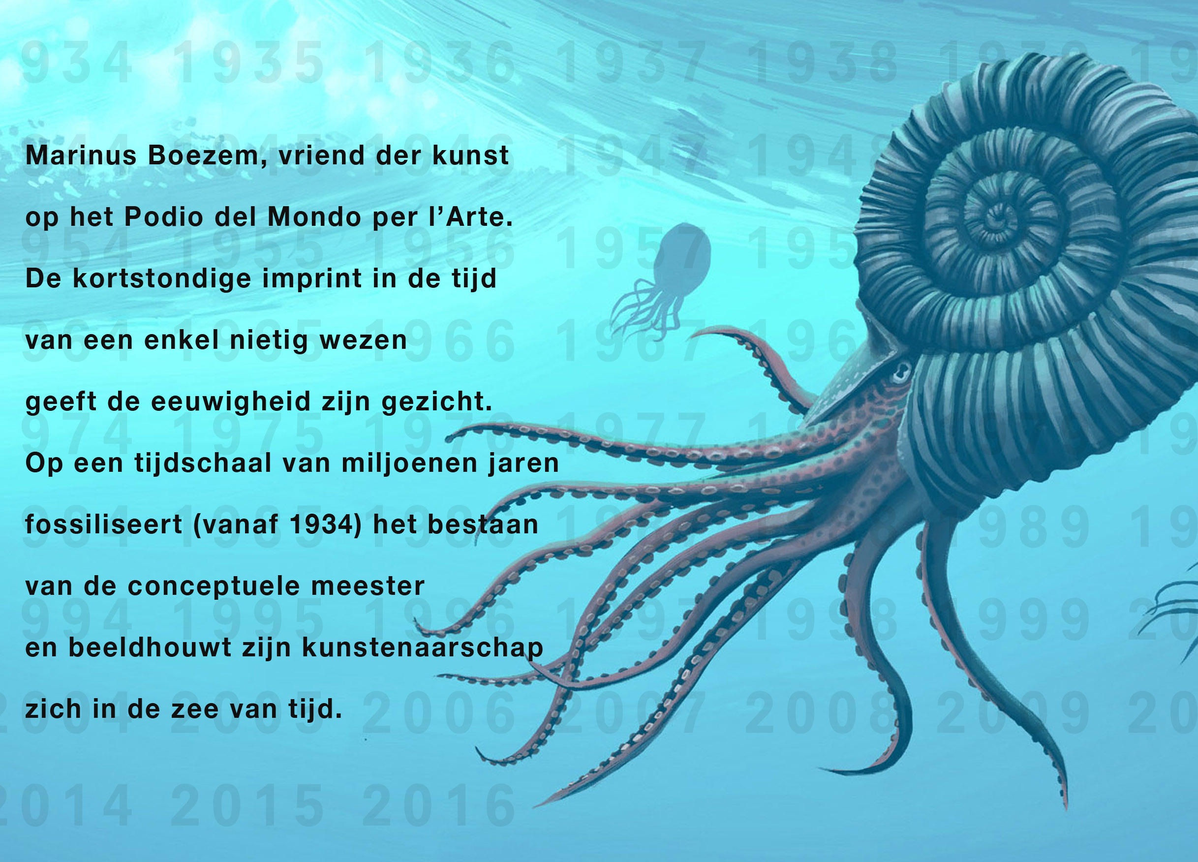 Hans van Houwelingen: Dear college Marinus Boezem. You asked me to contribute a stone to your Podio de Mondo per l’Arte. Here is my design. I humbly wait for your approval, love to hear what you think of it. The puny existence of a single squid or ammonite proves to relate to an ocean of time, their momentary imprint in time even gives eternity its face. That is why I have placed Podio del Mondo per l’Arte into a context of millions of years. On this scale of time your existence in this world, from 1934 on, is fossilized and sculpts your artistry into infinity. I place this stone on Podio de Mondo per l’Arte, being an ode to the conceptual artist, my friend Marinus Boezem. Measurement of the stone: 100 x 35 x 5 cm.