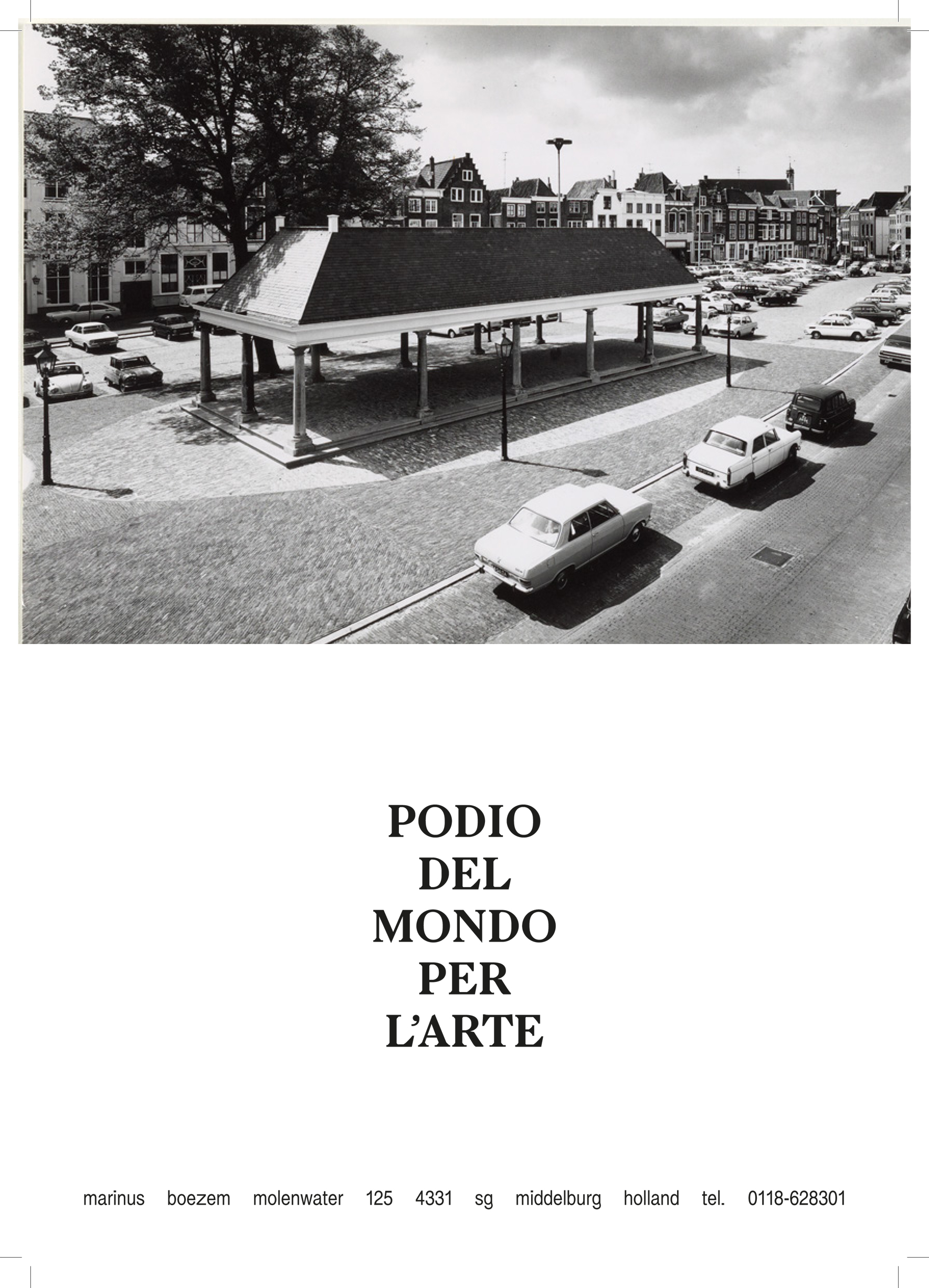 In 1976 Marinus Boezem (1934) appropriated the space of the former Graanbeurs at Dam Square in Middelburg as an international stage for conceptual art: "Podio del Mondo per l’Arte". Over the years, he invited several conceptual artists, like Lawrence Wiener and Herman de Vries, to design a stone to be placed on this platform. In 2016 Boezem asked artist Hans van Houwelingen to lay a stone on the conceptual podium.